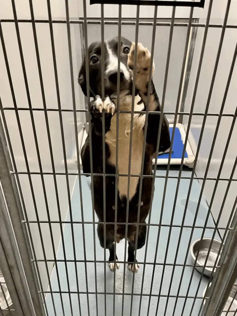 Standing on her hind legs, Maya pressed her front paws against the metal bars and gave Madeline a look that said everything words never could.