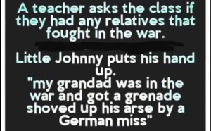 Little Johnny puts his hand up. “my grandad was in the war and got a grenade shoved up his arse by a German miss”, The teacher replies, “Rectum Johnny, rectum” Johnny says… “Rectum miss?.. It nearly f””king killed him!”.