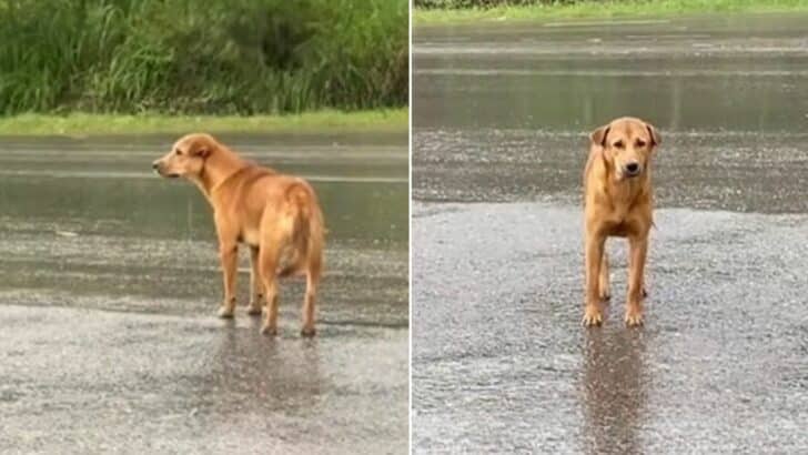 A canine who spent days on a roadside in the heavy rain felt devastated as he waited for his family to take him home.