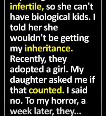 My only daughter has always known my position: I wanted my family’s inheritance to pass down through bloodline and future generations. Years ago, when she learned she was infertile and couldn’t have biological children, I told her gently but honestly that if she never had children, my estate would instead go to other relatives so the money could stay within the family line. She was hurt, but I believed I was being practical.