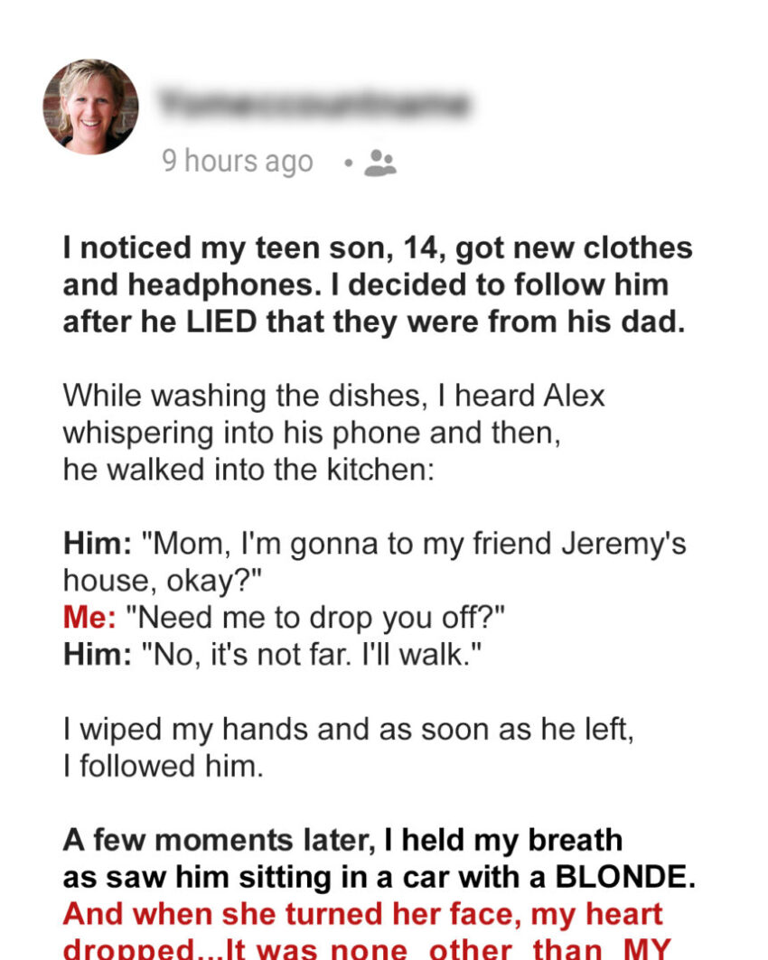 OMG, as I got there, there they were, the overhead lights of Jean’s car cast a spotlight on the betrayal: my husband, with our best friend enveloping him in her arms, their lips locked in a forbidden embrace in the front seat of her car!