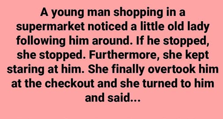 A young man noticed an elderly lady following him around while shopping in a supermarket. She stopped when he stopped and kept staring at him. Eventually, at the checkout, she approached him and said,