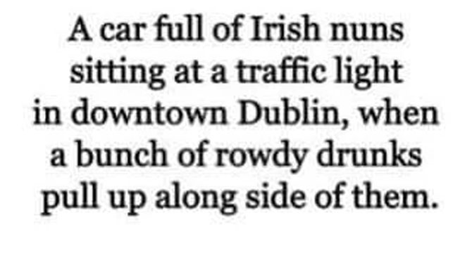 A car full of Irish nuns sitting at a traffic light in downtown Dublin, when a bunch of rowdy drunks pull up along side of them.