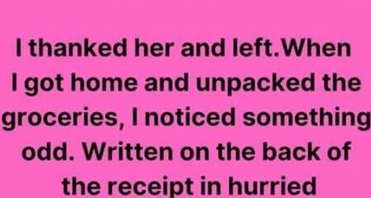 When I got home and unpacked the groceries, I noticed something odd. Written on the back of the receipt in hurried handwriting was: “Check your tires. Someone slashed mine in this parking lot.”
