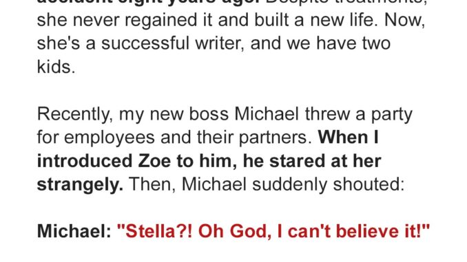 At a work party, Zoe’s new boss, Michael, unexpectedly recognized her as “Stella,” a woman who had been missing for years. Zoe panicked and warned him to keep her identity a secret. Later, she admitted her memory had returned two years ago, but she kept it hidden due to fear of her abusive ex-boyfriend, who had left her for dead after the accident. Michael revealed her ex was still searching for her, and we had to take immediate action to protect her.