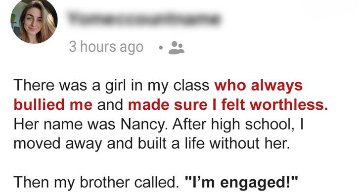 That hope was shattered when my brother Matt called to announce his engagement to Nancy. My stomach dropped as I recalled the torment she had put me through. Despite my protests, Matt insisted that people change, so I reluctantly agreed to attend the engagement party, hoping she had indeed transformed. But when I saw her, the same polite smile masked her venomous nature, and I quickly realized that nothing had changed.