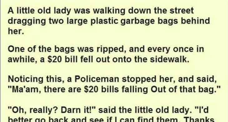 A little old lady was walking down the street dragging two large plastic garbage bags behind her. One of the bags was ripped, and every once in awhile, a $20 bill fell out onto the sidewalk. Noticing this, a Policeman stopped her, and said, “Ma’am, there are $20 bills falling Out of that bag. “Oh, really? Darn it!” said the little old lady. “I’d better go back and see if I can find them. Thanks for telling me officer..” “Well, now, not so fast,” said the cop. “Where did you get all that money?