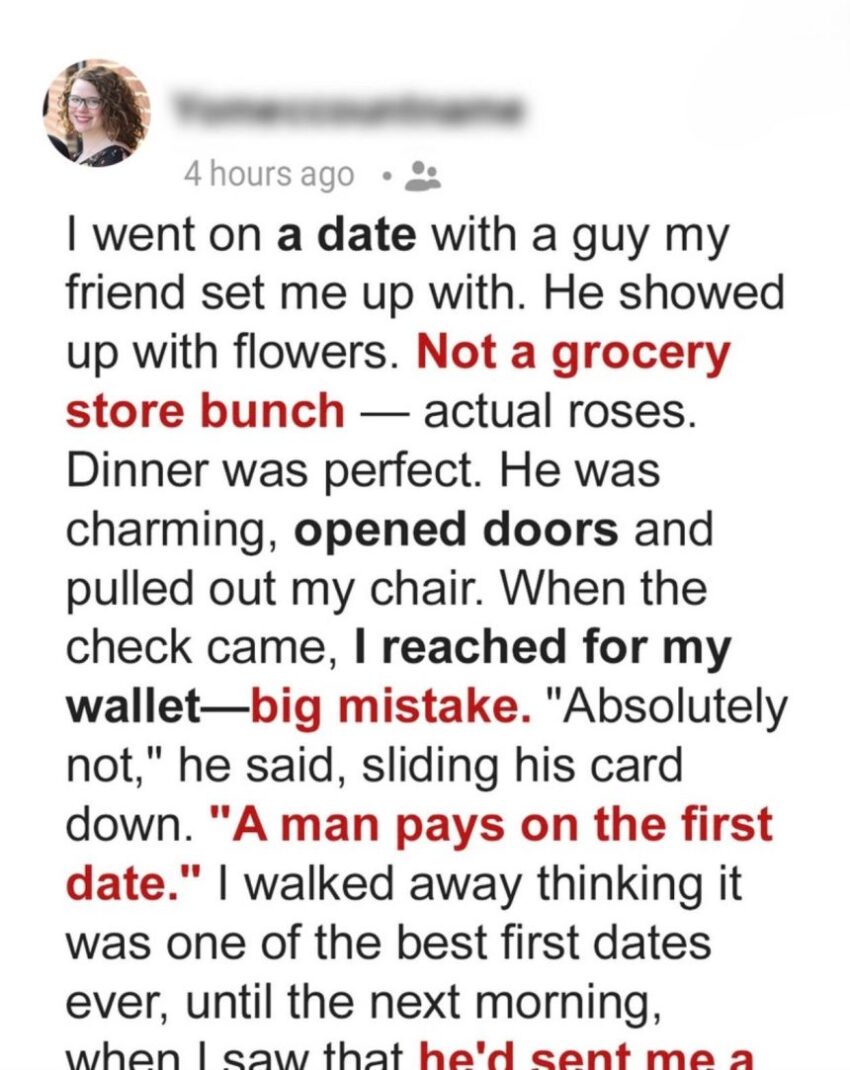 When Eric insisted on paying for our first date, I thought I’d met a true gentleman. Roses, a sweet gift, charming conversation — he was checking all the boxes. When he texted me the next day, I expected a cute follow-up, but my stomach dropped when I read his message.