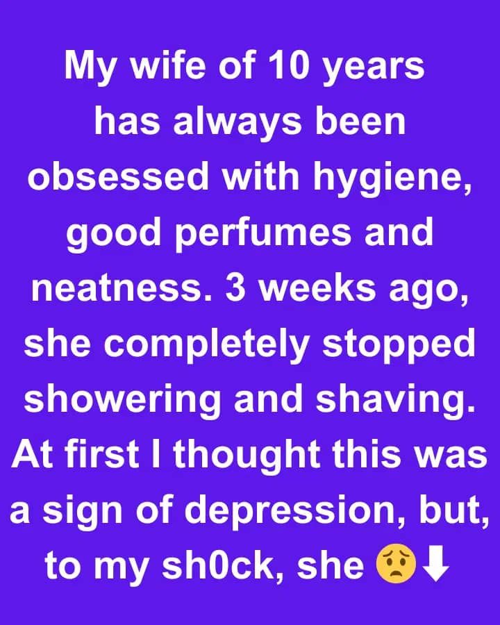 My wife of 10 years has always been obsessed with hygiene, good perfumes and neatness. 3 weeks ago, she completely stopped showering and shaving. At first, I thought this was a sign of depression, but, to my shock, she was cheerful and didn’t seem heavy-hearted or withdrawn.
