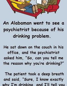 An Alabaman went to see a psychiatrist because of his drinking problem. He sat down on the couch in his office, and the psychiatrist asked him, “So, can you tell me the reason why you’re drinking?”
