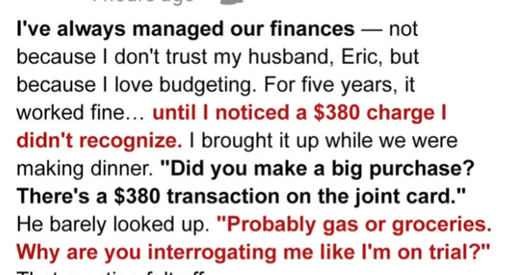 One Friday night, during my usual ritual of scrolling through our bank statement, something caught my eye: a $380 charge I couldn’t place. I asked Eric about it, but his response was defensive, even angry, which was unlike him.