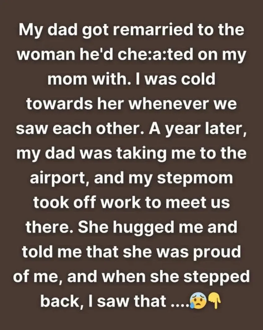 A year later, my dad was taking me to the airport on my way to college, and my stepmom took off work to meet us there and send me off with a care package.