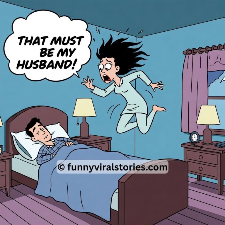 The woman, bewildered, jumped up from the bed and yelled at the man, “Holy crap. That must be my husband!”
