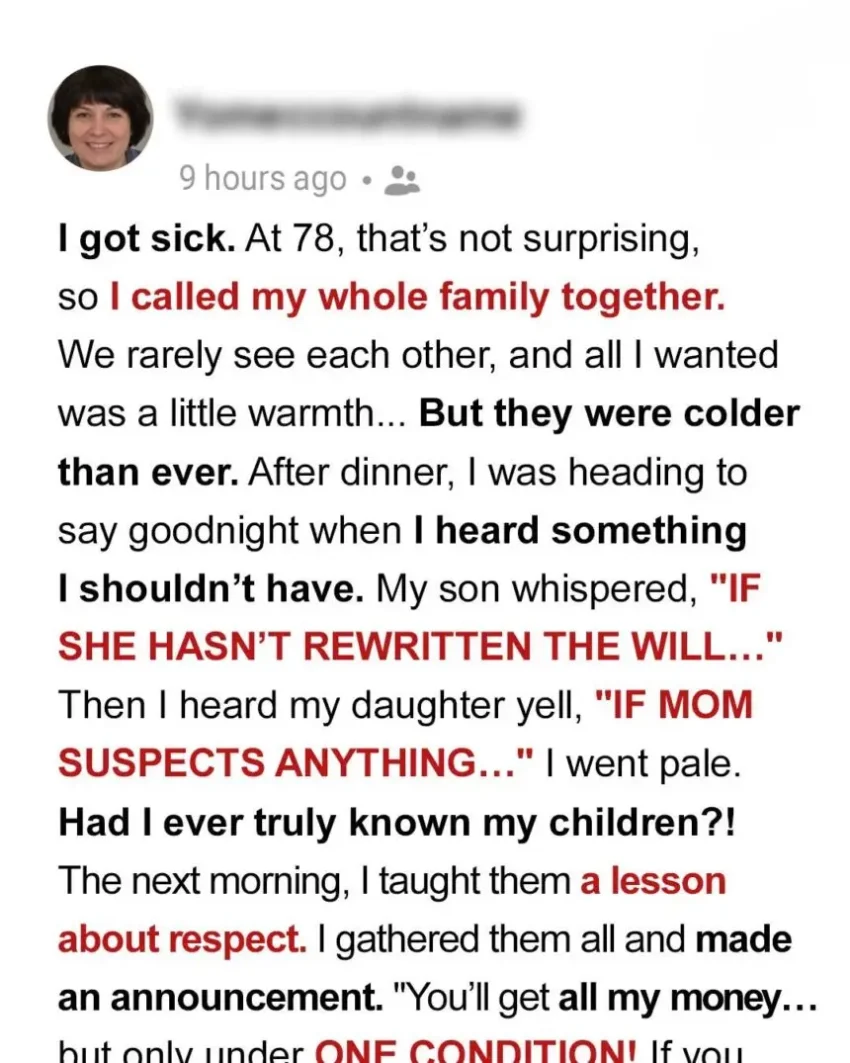 Yet, something in her words made me pause. My condition did require attention. But not medical attention. Family attention. If it were up to them, they wouldn’t have even asked if I was still breathing when I was taken to the hospital. But at that moment… Well, I could remind them of who I was.
