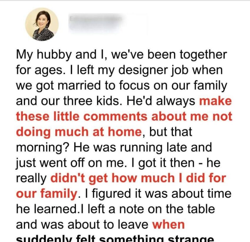I packed a small bag and was about to leave when I suddenly felt something strange. A wave of guilt washed over me. Was this the right thing to do? Was I overreacting? But then, I remembered the countless days and nights I spent cleaning, cooking, and taking care of the kids without a single complaint. I took a deep breath and walked out the door.