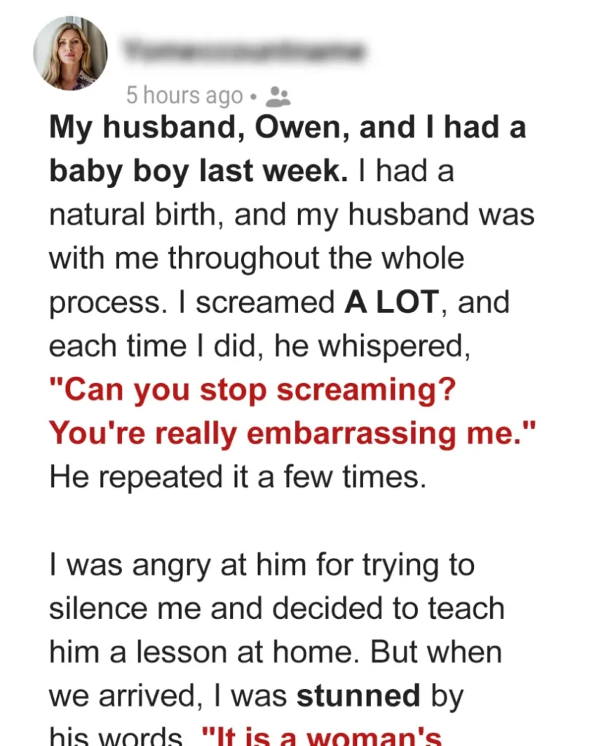 “Owen,” I started, my voice steady but soft, “we need to talk about what happened at the hospital.” His eyes met mine, a flicker of uncertainty in them. He nodded, and I took it as my cue to continue. “Do you remember, during labor, when you asked me to stop screaming? You said I was embarrassing you.”