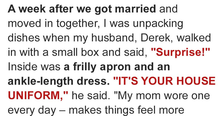 A week after our honeymoon, I was still on cloud nine, unpacking boxes in our new home when Derek surprised me with a gift: a frilly apron and a long black dress, which he called a “house uniform.” He explained that it was a tradition from his family, but I was taken aback. I had worked hard to build my career and had no intention of becoming a traditional housewife.