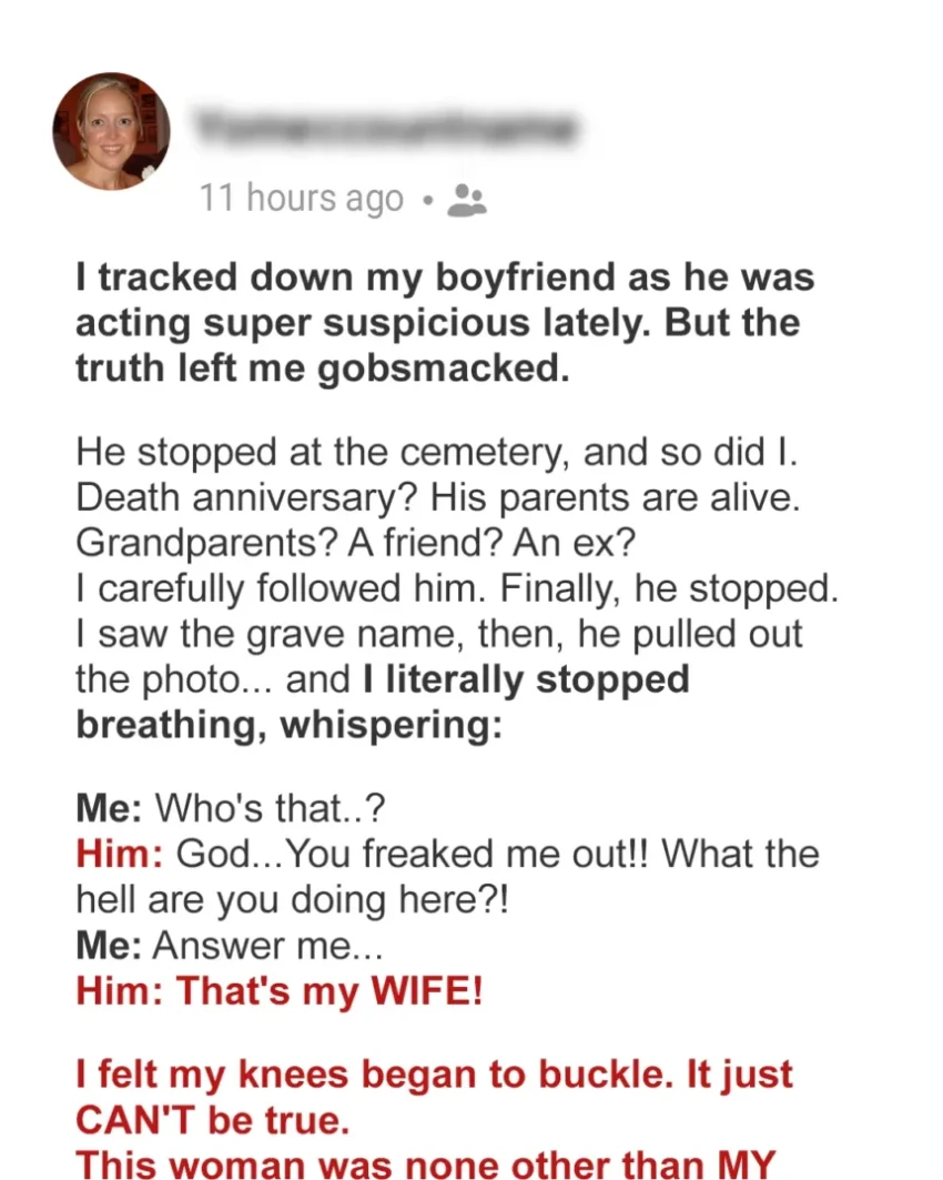 When he finally stopped at a grave, I hid behind a large oak tree, watching him. He just stood there, looking down, his shoulders heavy with what I assumed was grief. At that moment, my fear and confusion turned into a profound sadness. Seeing him like this, vulnerable and alone, made me realize this wasn’t about betrayal; it was about pain.