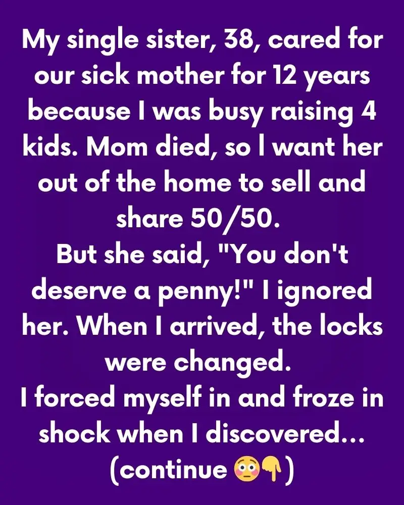 My single sister, 38, cared for our sick mother for 12 years because I was busy raising 4 kids. Mom died, so I want her out of the home to sell and share 50/50. But she said, “You don’t deserve a penny! You were not a devoted daughter!”
