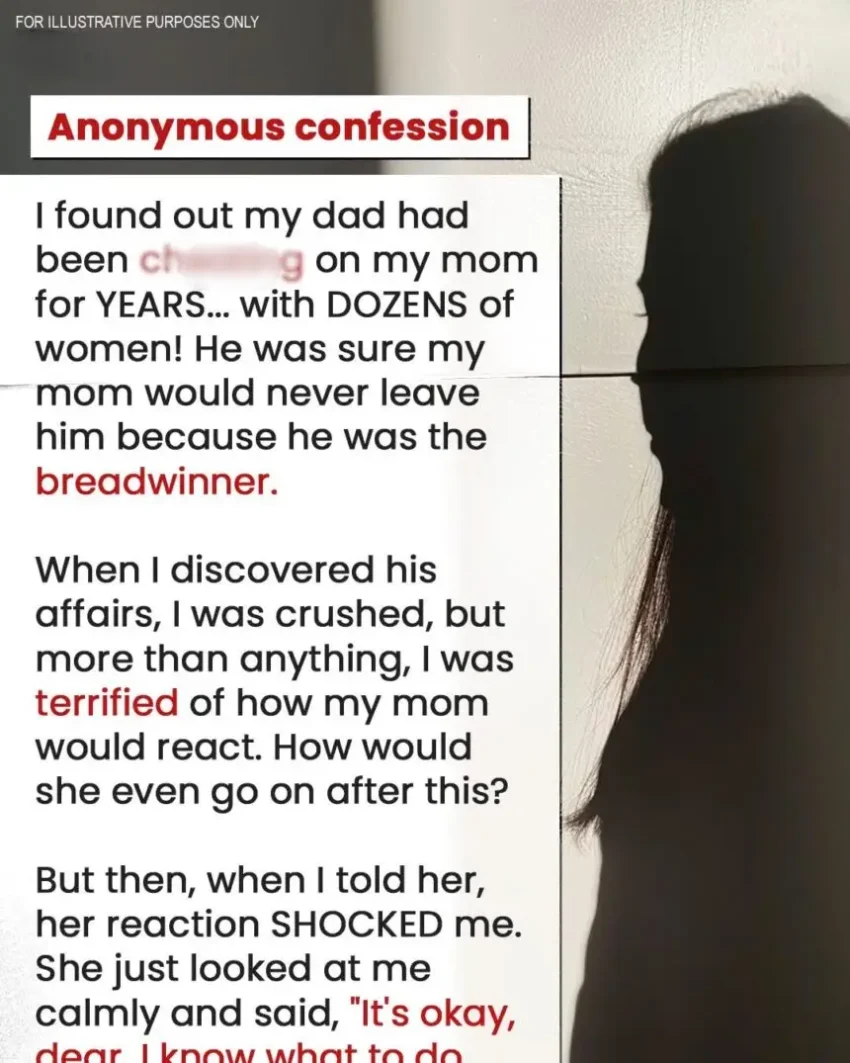 “Mom, I found something… something terrible. Dad… he’s been cheating on you. For years. With so many women.” I expected her to break down, to cry or scream. But she just looked at me, her face calm.