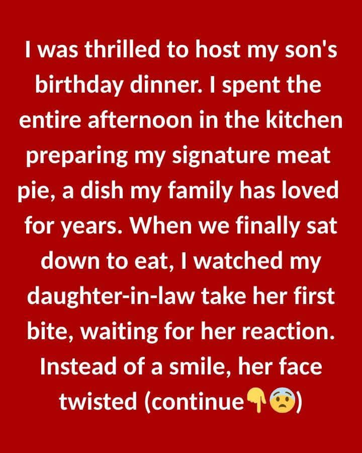 I was thrilled to host my son’s birthday dinner. I spent the entire afternoon in the kitchen preparing my signature meat pie, a dish my family has loved for years. When we finally sat down to eat, I watched my daughter-in-law take her first bite, waiting for her reaction.