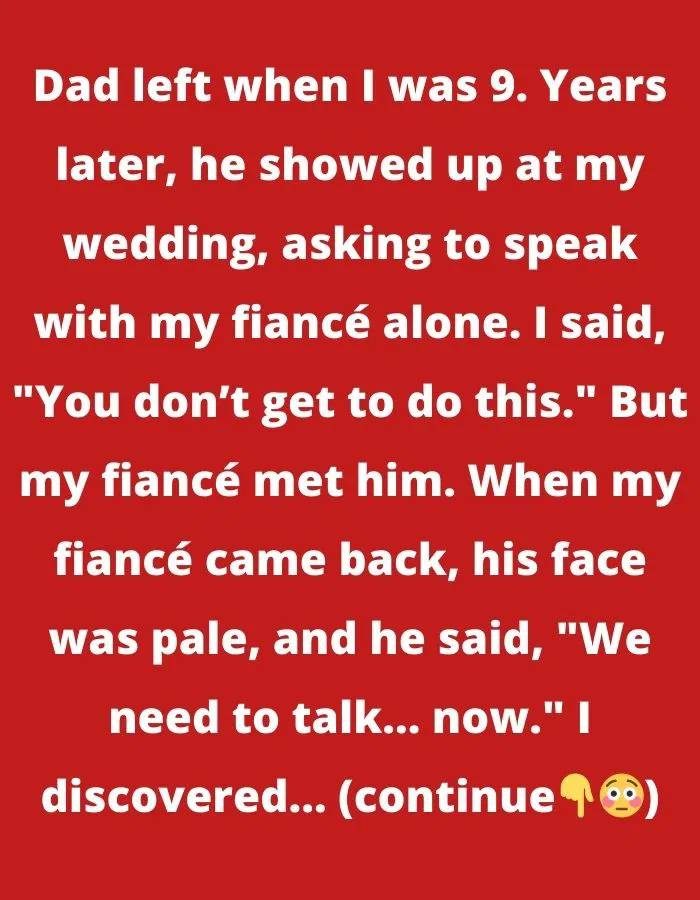 My father left us when I was 9. Two decades later, he showed up unannounced at my wedding, demanding to speak with my fiancé alone. I refused, but my fiancé agreed to hear him out.