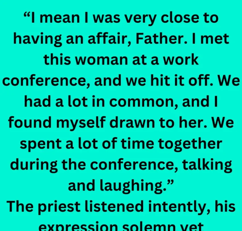 “I mean I was very close to having an affair, Father. I met this woman at a work conference, and we hit it off. We had a lot in common, and I found myself drawn to her. We spent a lot of time together during the conference, talking and laughing.”