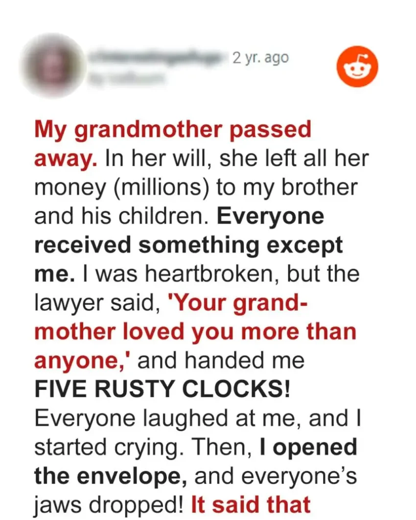 After that , the lawyer turned to me, smiling gently. “Linda, your grandmother left you her clocks.”