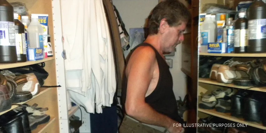 There, standing between my work clothing and Emmie’s dresses, was an older man, buttoning his clothes.