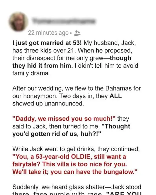 I just got married with Jack, who has three kids over 21. He was devastated when I met him two years after his wife passed away. When he proposed, his children’s disrespect for me only grew-though they hid it from him. I didn’t tell him to avoid family drama.