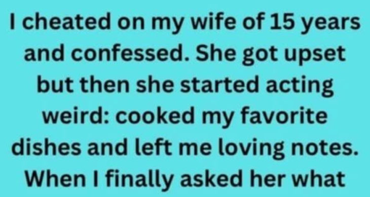 I cheated on my wife of 15 years and confessed. She got upset, but then she started acting weird: cooked my favorite dishes and left me loving notes. When I finally asked her what was wrong, she smiled and then announced to me that… she was leaving,