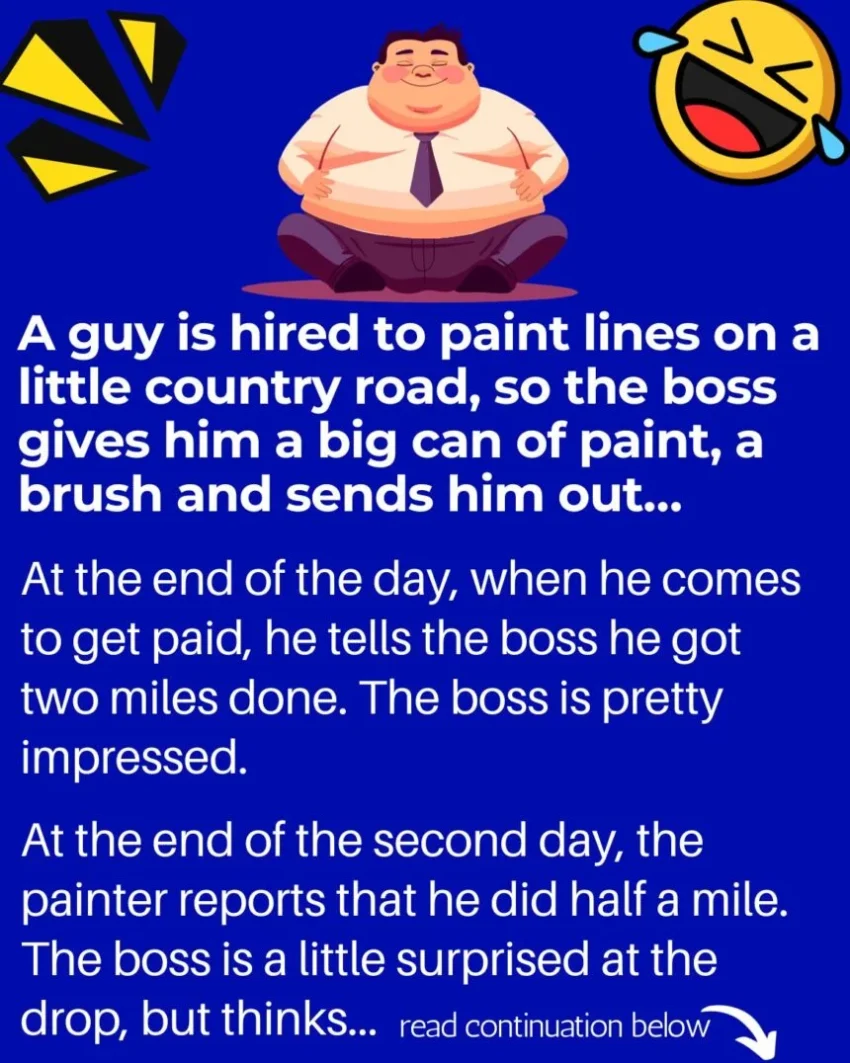 A guy is hired to paint lines on a little country road, so the boss gives him a big can of paint, a brush and sends him out…