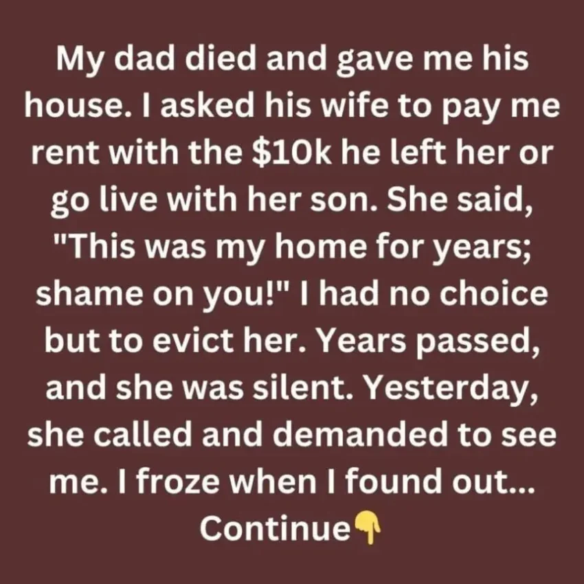 My dad died and gave me his house. I asked his wife to pay me rent with the $10k he left her or go live with her son.