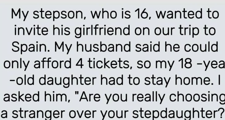 My 16 y.o. stepson wants to invite his new girlfriend on our trip to Spain. My husband agreed but said he can’t afford more than 4 tickets, so we have to leave my 18 y.o. daughter at home. I was furious and blamed him for choosing a stranger over his own stepdaughter whom he’d been raising since she was 7. He replied,