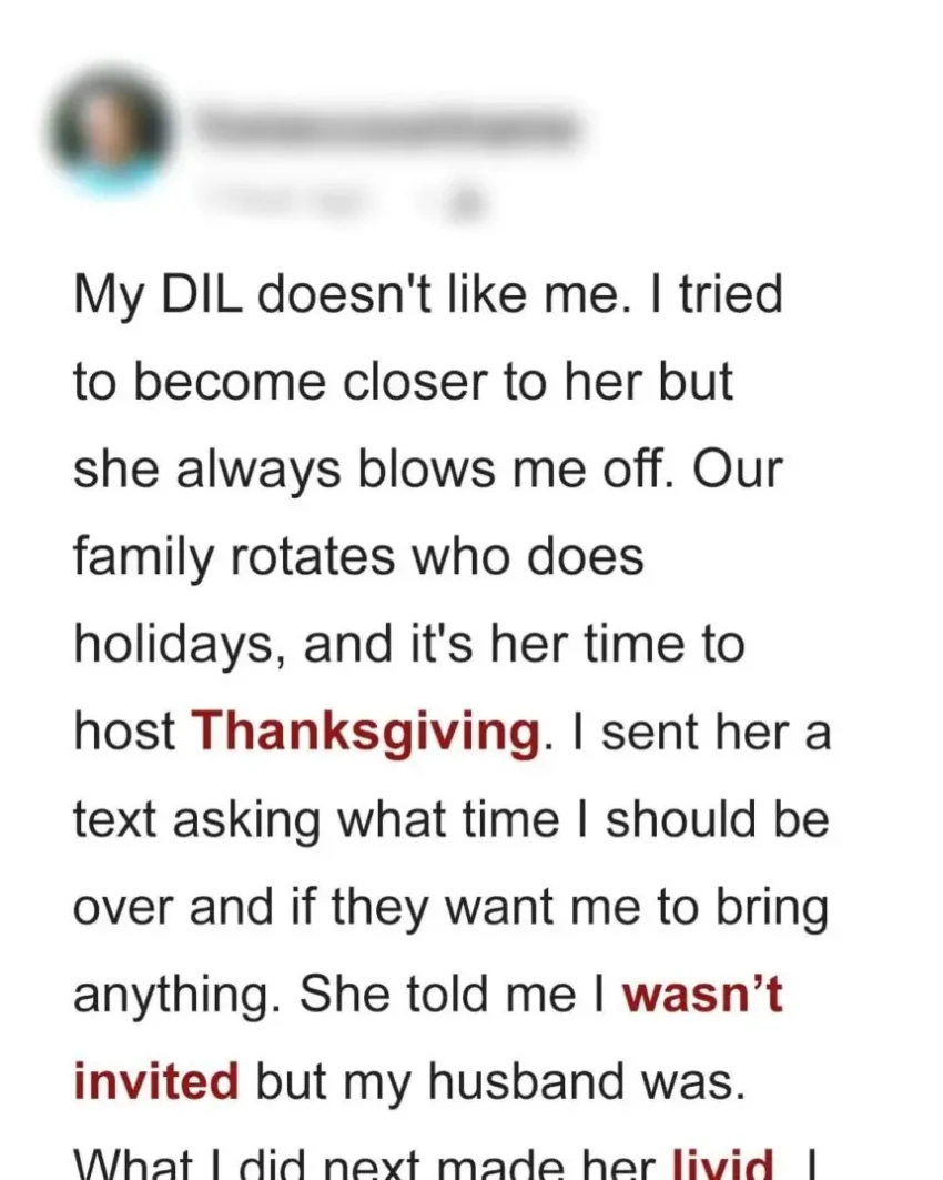 “My MIL, Margaret, never holds back on criticizing my cooking. This Thanksgiving was no exception. She sighed dramatically, deeming my turkey ‘too dry,’ salad ‘too salted,’ and potatoes ‘awful,’” explained Emma.