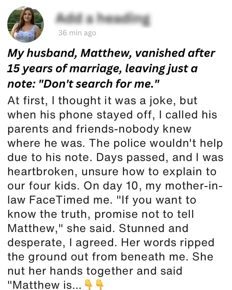 I stared at the note, hoping it was a bad joke. Matthew loved pranks, but this felt different. I grabbed my phone and dialed his number, only to hear it go straight to voicemail.