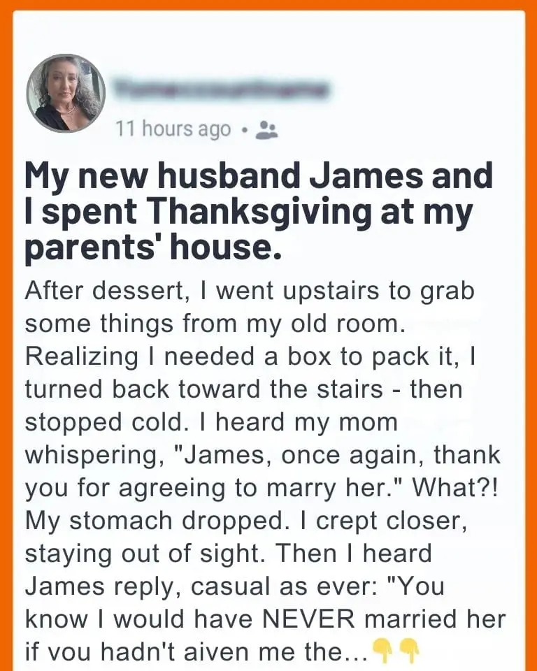 “I told you,” my mom whispered, her voice insistent. “She’s fragile. Nobody else would’ve… well, you know. Just be patient, James. It’s not forever. Soon, when she’s doing better at work, you can leave. She needs her confidence up first.”
