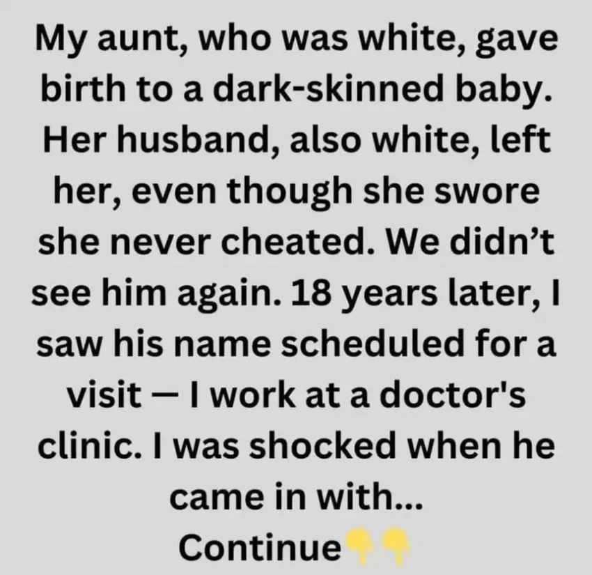 My aunt, who was white, gave birth to a dark-skinned baby. Her husband, also white, left her, even though she swore she never cheated.