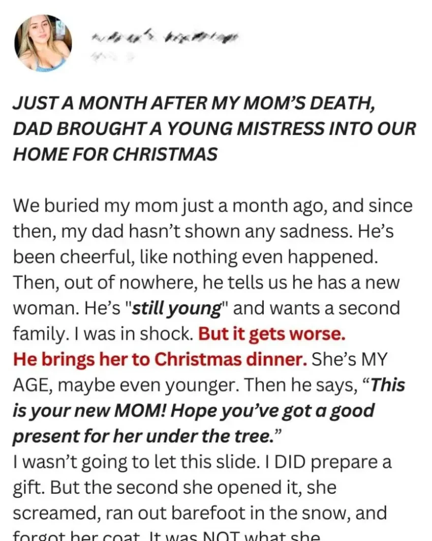 Just a month after my mother lost her battle with cancer, Dad brought his mistress home for Christmas and introduced her as my “NEW MOM.” My heart shattered, but it wasn’t the only thing that left me shaken.