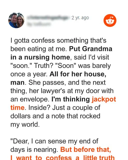 A man blindly in love with his evil fiancée was forced to deceive his granny and abandon her in a nursing home. However, the grandmother found a way to teach him a lesson and open his eyes to expose his lover’s real face. After her death, the man received an envelope with some money and a cryptic message that would change his life.