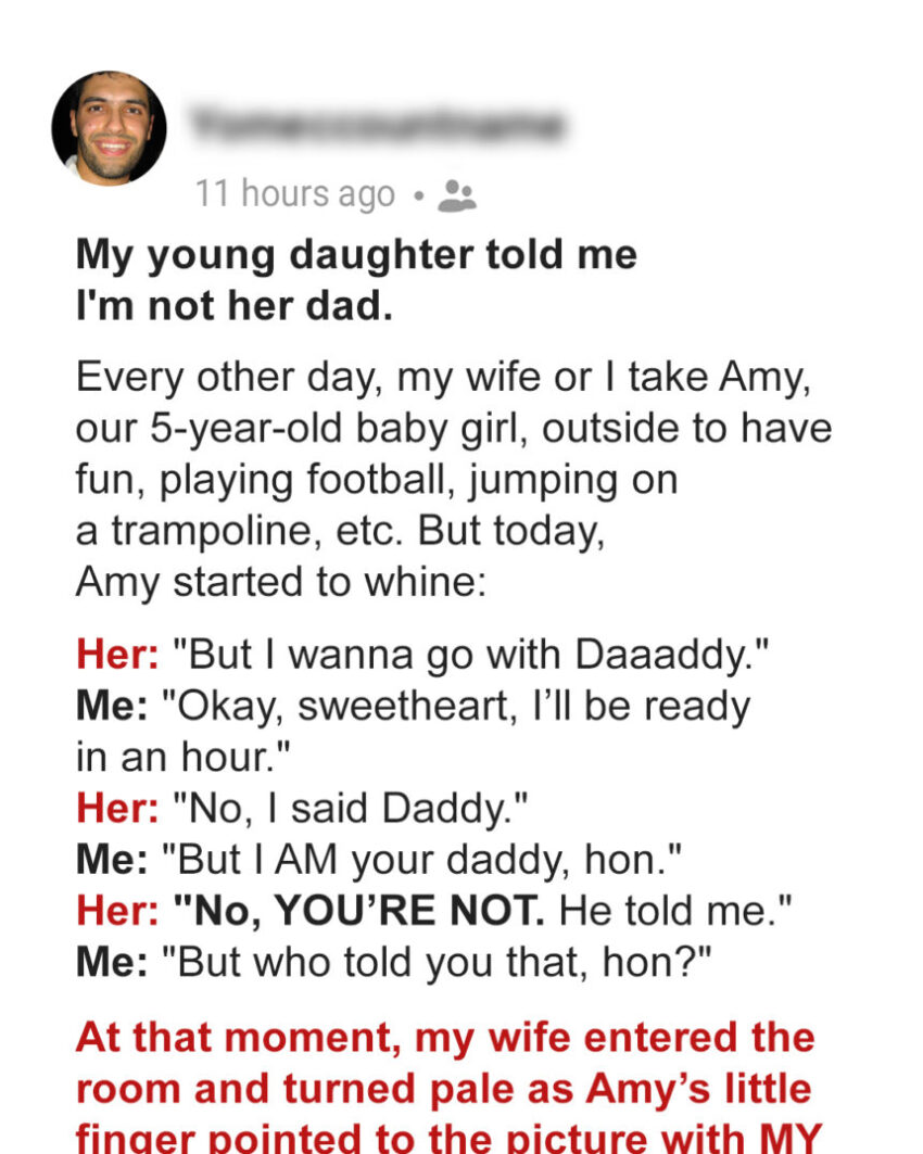 I’m still trying to process this, and honestly, I don’t know what to do. My little girl, Amy, who’s just five, dropped a bombshell on me that’s shattered my world. She said, “Daddy, you know you’re not my real daddy, right?”