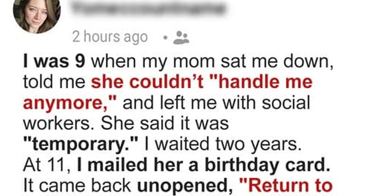 When I turned 11, I decided to send her a birthday card. I’d saved up my allowance and picked out the prettiest one I could find. It had flowers on it and said “Happy Birthday, Mom” in gold letters.