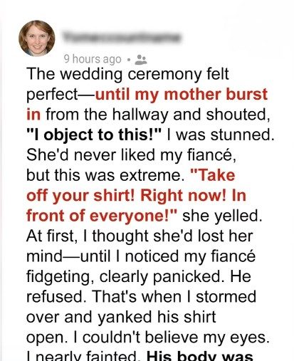 On what was supposed to be the happiest day of my life, my mother shocked everyone by yelling, “I OBJECT! Make the groom take off his shirt right now!” The entire room fell silent as Chris nervously hesitated, then reluctantly pulled open his shirt. That’s when I saw the bright red lipstick stains smeared across his collarbone and neck. My heart sank.