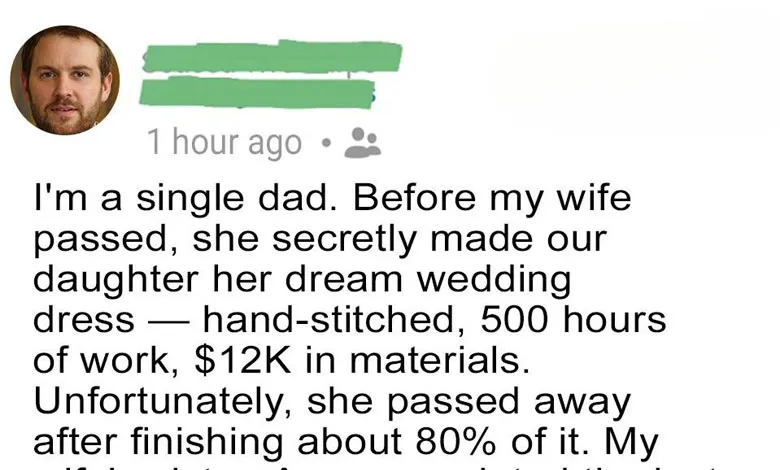 My late wife Linda was a master seamstress. Even during her final months battling cancer, she poured her love into one last creation: our daughter Sammy’s dream wedding dress. Inspired by magazine clippings and Pinterest boards, the dress was a masterpiece made with genuine silk, Swarovski crystals, and hand-stitched lace. Linda spent 500 hours sewing it in secret before she passed. After her funeral, her sister Amy completed the dress, and it became the most meaningful heirloom we had left a $12,000 legacy filled with love, grief, and hope.