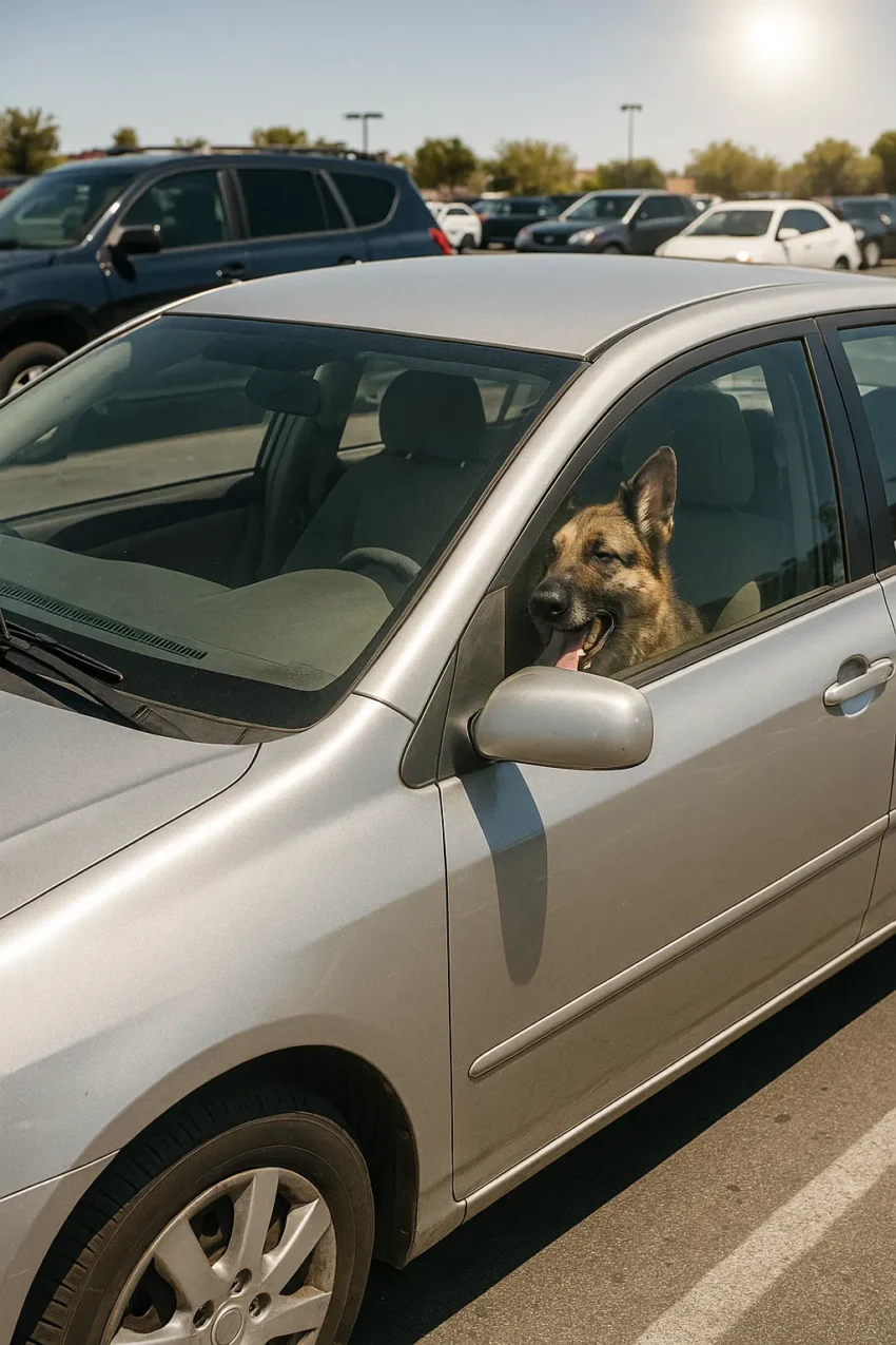 A parked silver sedan, just a few spots down. Inside it… a dog. A German Shepherd.
