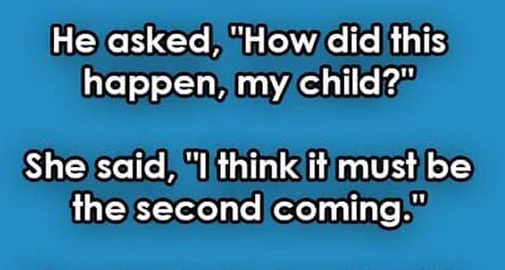 She said, “I think it must be the second coming. ”The priest, shocked by this reply, asked,