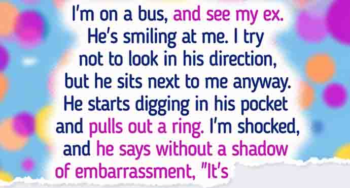 I’m on a bus, and see my ex. He’s smiling at me. I try not to look in his direction, but he sits next to me anyway. He starts digging in his pocket and pulls out a ring.