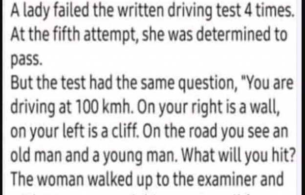 A lady failed the written driving test 4 times. At the fifth attempt, she was determined to pass. But the test had the same question, “You are driving at 100 kmh. On your right is a wall, on your left is a cliff.