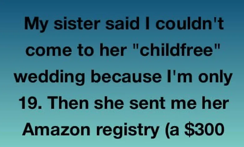 When my sister told me I wasn’t invited to her “childfree” wedding because I was 19, it stung. I was working two jobs, going to college, and paying bills — far from a toddler. Then she sent the Amazon registry with a cheerful note: “You’re still family!” I had no money for a $300 blender, but I had memories.