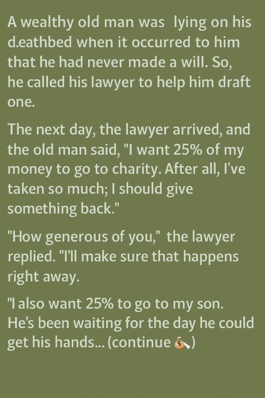 A wealthy old man lay on his deathbed, realizing heâd never written a will. He summoned his lawyer the next morning.